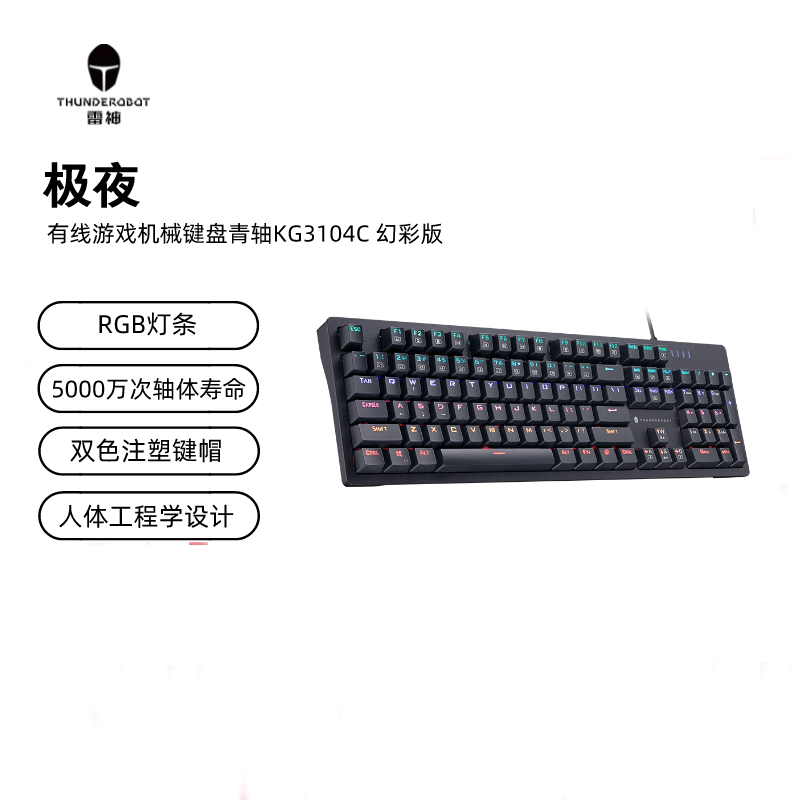 - 型号:雷神KG3104混光版104键机械键盘极夜黑青轴