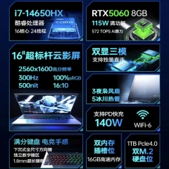 猎刃16 16英寸游戏本(酷睿16核i7-13650HX 16G 512G 4060 16Hz 2.5K)