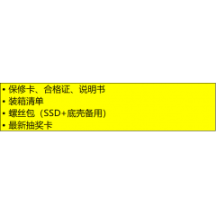 - 其他附件:"• 保修卡、合格证、说明书 • 装箱清单 • 螺丝包(SSD+底壳备用) • 最新抽奖卡"