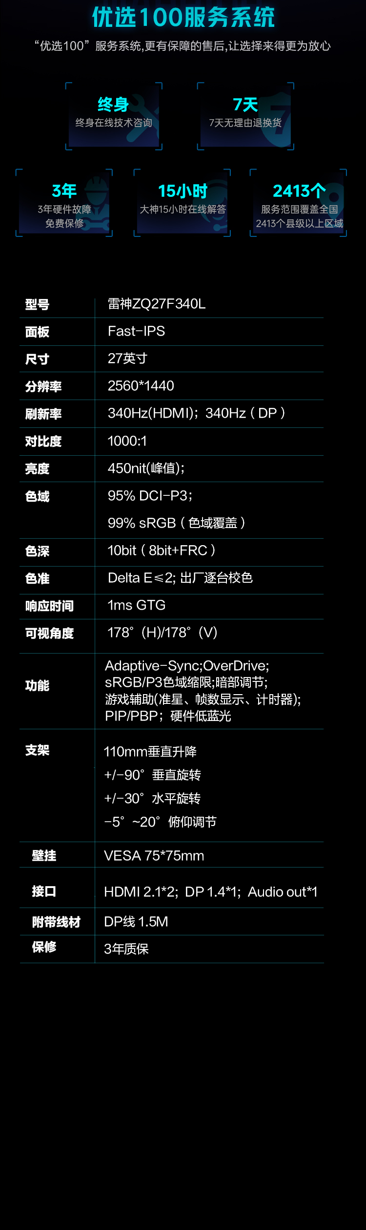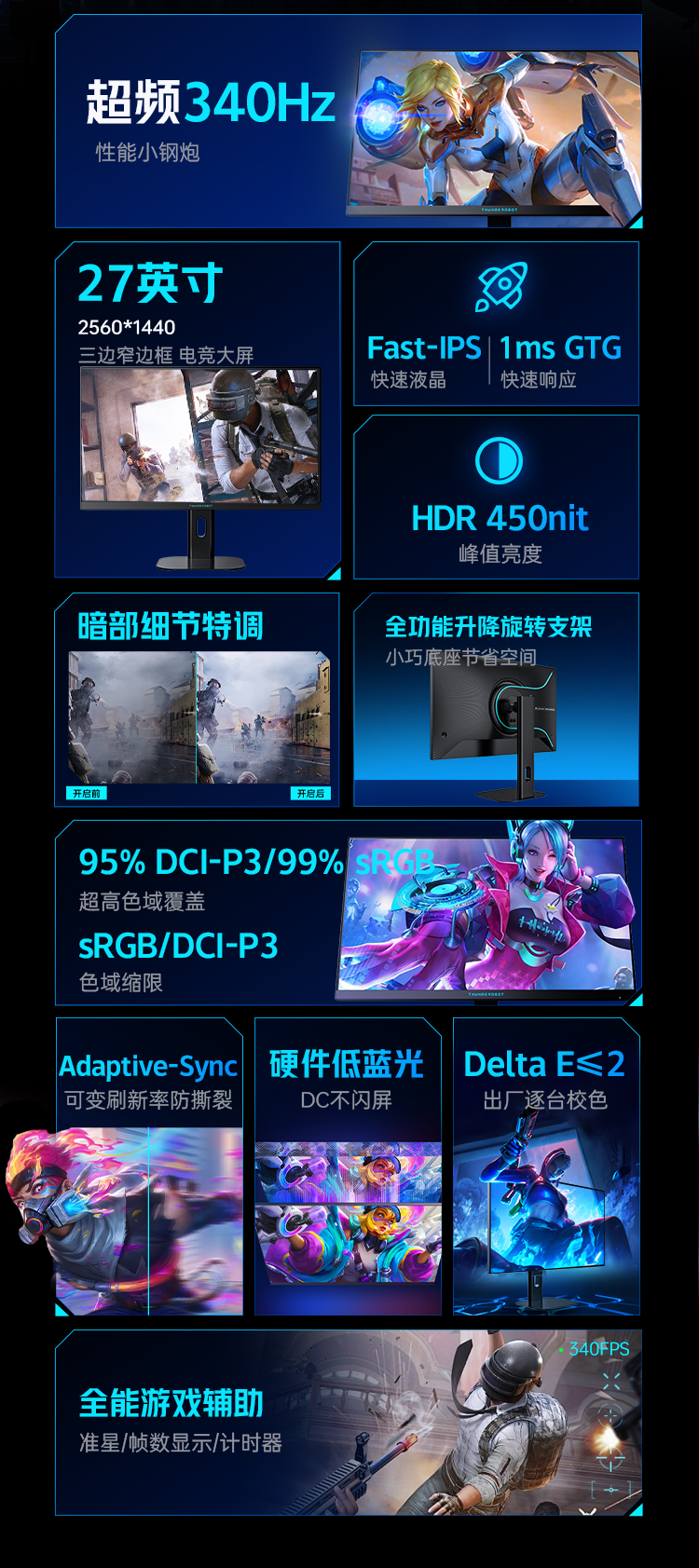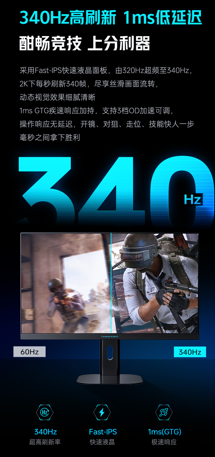 雷神显示器340Hz超频Fast-IPS硬件低蓝光27英寸显示屏ZQ27F340L