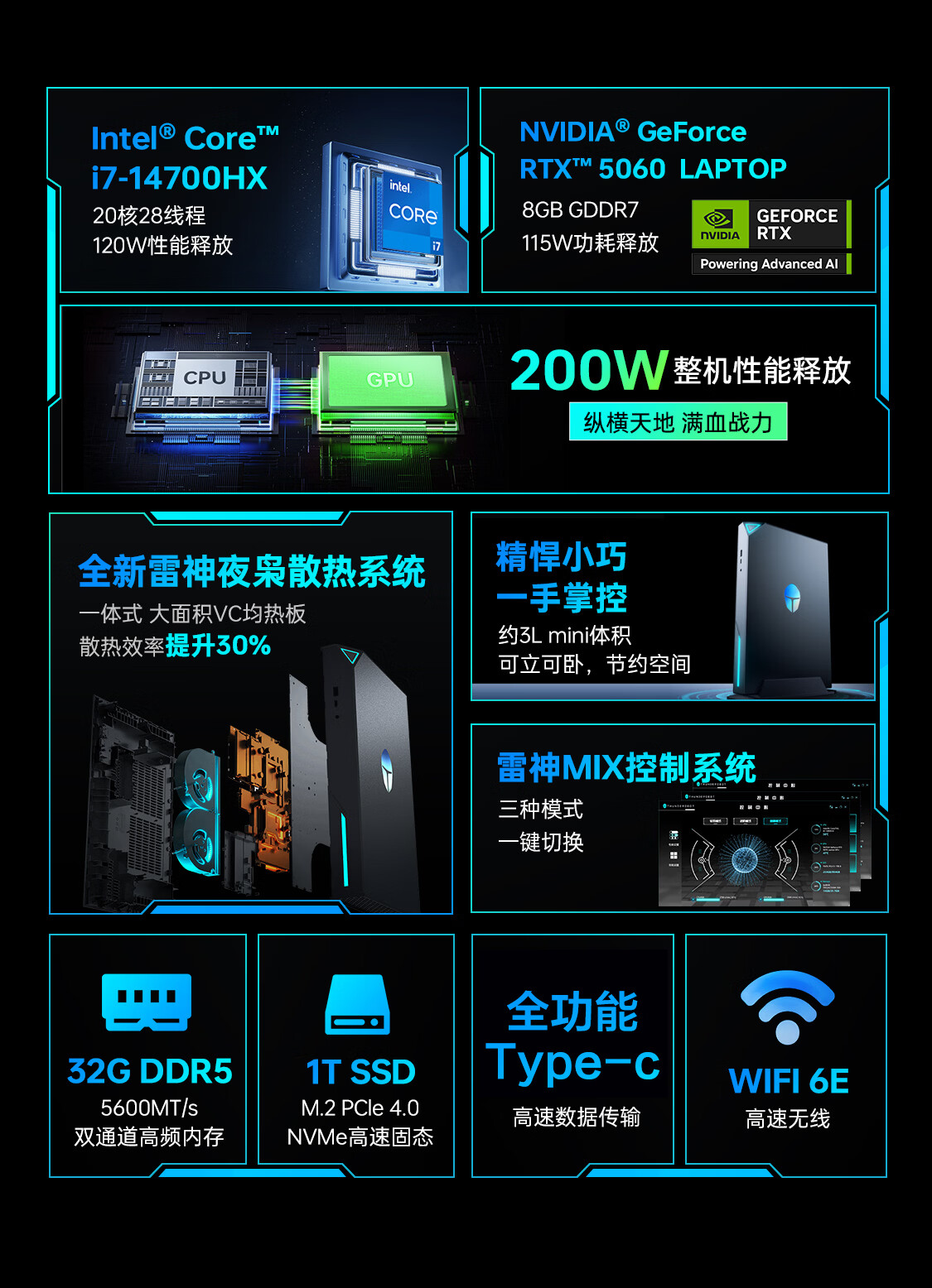雷神MIX电竞游戏办公迷你主机Ultra 7 255HX 5070Ti 32G内存1TB固态游戏迷你主机