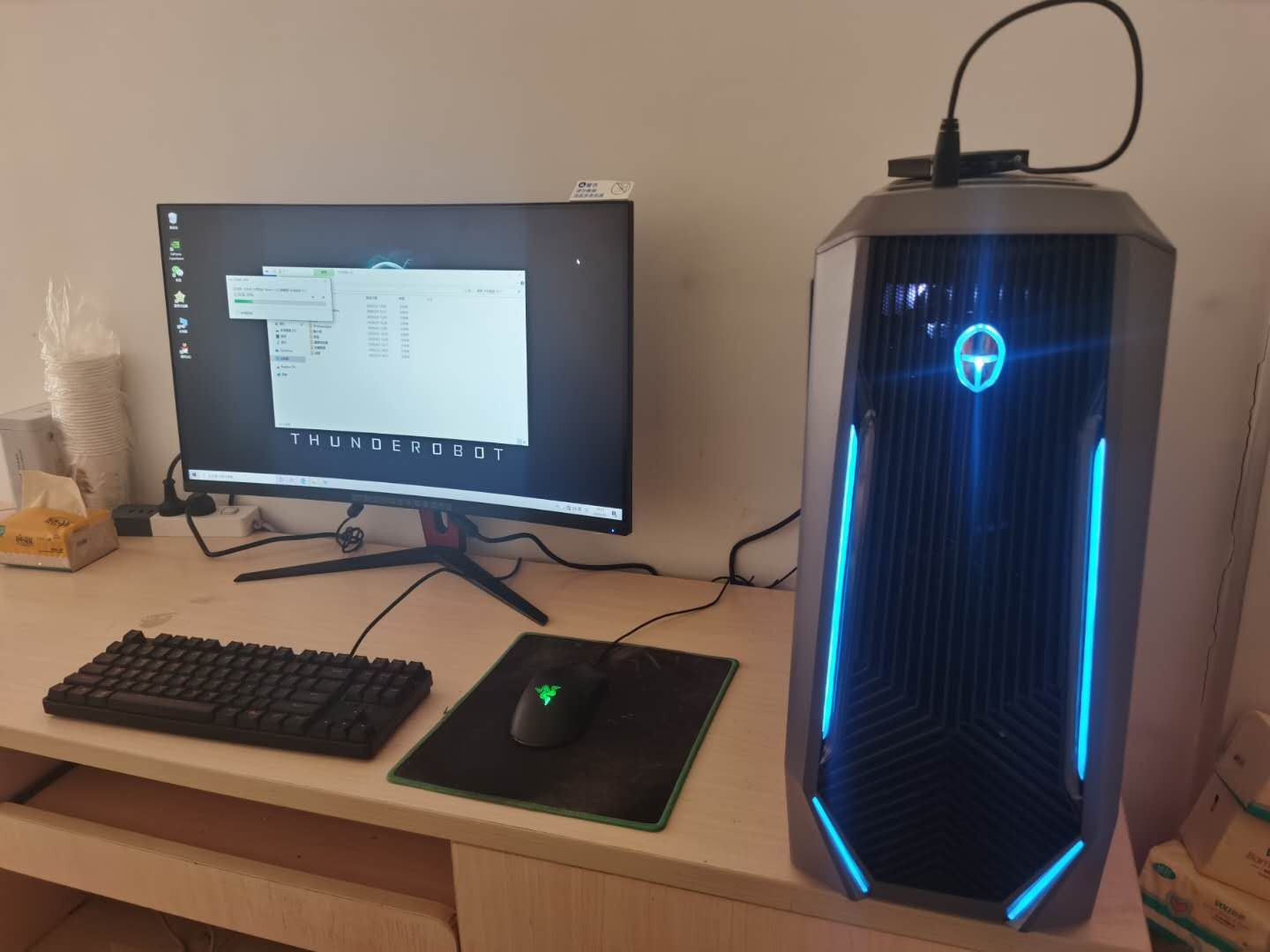 第一次用的台式机,之前都是笔记本玩游戏,太卡了。雷神的主机让我有了新的体验,开机块,满满科技感,透明侧箱,给力!